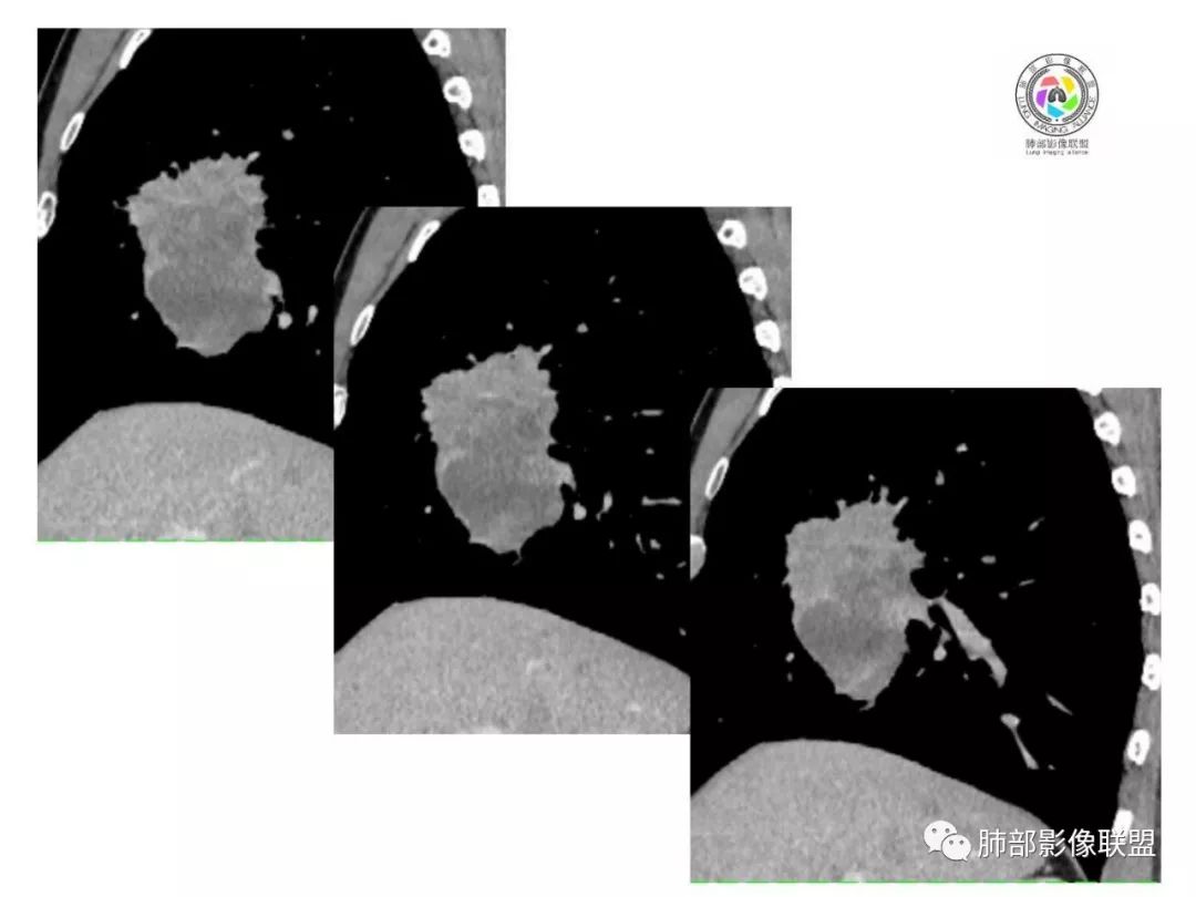 @吴婧南京市第一医院 这个从影像表现,坏死情况,以及叶裂推移情况与支气管推移情况来看,还是支持中叶间质来源,外朝内生长,同时向上,向下,向内都有推移作用。