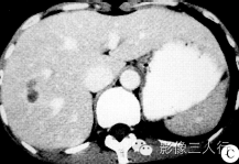 2.肝脓肿典型急性肝脓肿在脓腔形成后有典型“三环征”,内环呈单囊和多囊的脓腔,中间环有中等度延迟强化,外环水肿带较正常肝组织密度显著降低且无明显强化。慢性肝脓肿由于脓肿周围形成血管丰富的结缔组织被膜,脓肿壁显著厚环状强化,其密度高于肝组织。本例与急性者不符,与慢性者有相似处,但壁的厚度和强化程度均不够,且临床无明显感染症状,外周血白细胞不高,故首先不考虑。 医学百科网 | YxBaike.Com