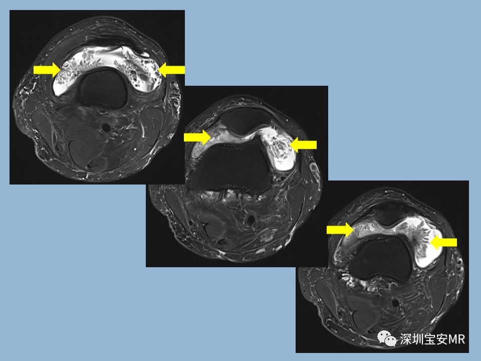 2、滑膜骨软骨瘤病:滑膜增厚不明显,关节面下骨质无破坏,特征性影像表现是“关节鼠”,T1WI见钙化,游离体内见高信号脂肪组织(红箭)。