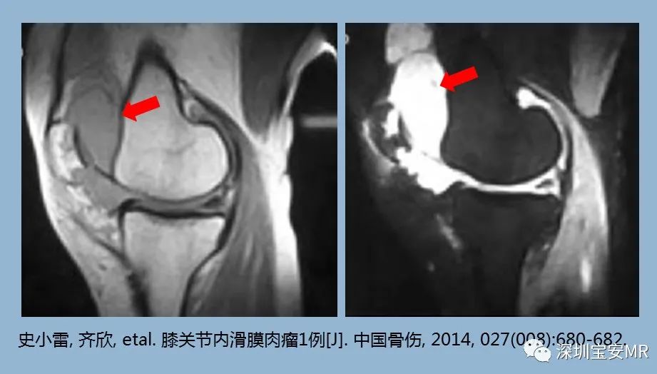 5、关节内滑膜肉瘤:滑膜肉瘤发生于关节内者罕见,MRI长T1、长T2信号,肿块表现为有隔膜的分叶状外观,可伴出血及钙化。