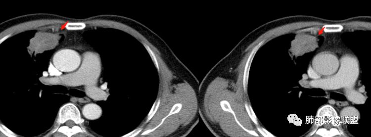 顺便说一下“糊墙征”,有两点要注意,一是与胸膜之间接触是钝角,即宽基底与胸膜接触,二是一般不侵犯胸膜下脂肪。请注意,不是只要软组织密度病灶接触胸膜就是糊墙征。