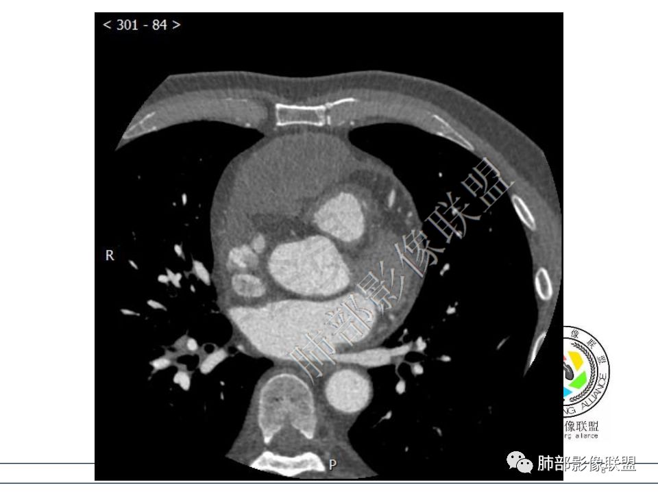 右室受压,但是脂肪间隙消失,跟第一例完全不同。