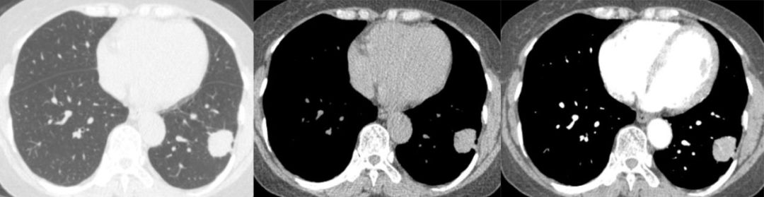 影像表现为较大的孤立性肿块,宽基底与胸膜相连, 中度均匀强化,肿块较大地图样强化,可有增粗迂曲血管及假包膜 医学百科网 | YxBaike.Com
