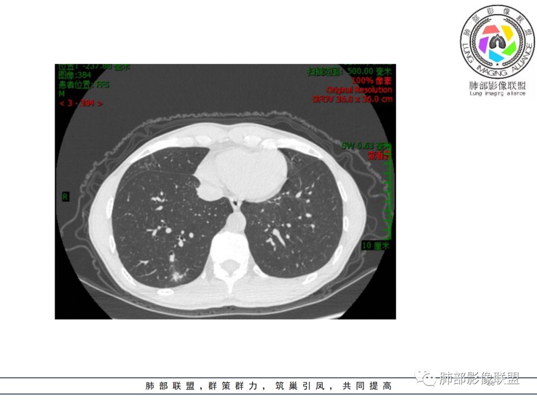 右肺下叶多发小结节,部分位于胸膜下,有晕,部分有沿支气管束走行感觉,右肺门淋巴结肿大,炎性,结核放前面,隐球菌待排;右肺下叶磨玻璃结节,边界清晰,太小,飞一下,如果开了,AIS或AAH都可能