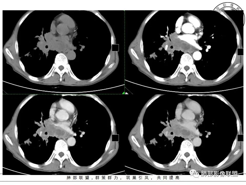 5.右肺门及纵隔见多数明显肿大淋巴结,环形或分隔样强化,这点表现相当显著。