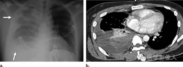 (a)胸片显示了右侧壁和肺底(箭)胸腔积液。这种新发的和相对比较迅速的胸腔积液的是令人担忧的血胸。(b)CT图像显示在右侧胸膜腔内高密度病变,与含血液成分相一致。病人随后进行了血胸引流手术。 医学百科网 | YxBaike.Com