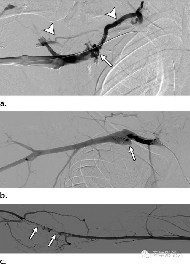 (a)一急性右臂肿胀的棒球运动员经右路静脉注射获得的数字减影图像(DSA)显示右锁骨下静脉(箭)的突然闭塞与梗阻部位近端(箭头)的侧支静脉充盈。这些表现与静脉性TOS一致,该病人随后行血栓切除术和明确的减压手术。 (b)28岁右上肢缺血性溃疡患者,选择性右锁骨下动脉注数字减影图像(DSA)显示右锁骨下动脉(箭)小叶假性动脉瘤。(c)同一病人的肱动脉数字减影图像(DSA)显示其闭塞(箭)。病人也有多个指动脉闭塞(未示出)。这些表现与动脉性TOS一致,是因为有明确的的锁骨下动脉外伤导致的动脉瘤和远端血管血栓形成。