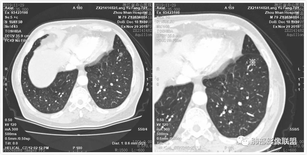左肺下叶前内基底段磨玻璃小结节,边界清,有分叶,直径8.5mm,CT值-450,内见增粗血管,VR表面有收缩,考虑浸润性病变,MIA 医学百科网 | YxBaike.Com