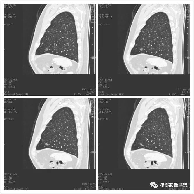 病例一:结节内空泡出现对鉴别性质具有较大价值。一般炎性结节出现率只有5%,早期普通型腺癌出现率50-60%,而粘液腺癌结节估计在10%左右!AIS空泡征发生率低。