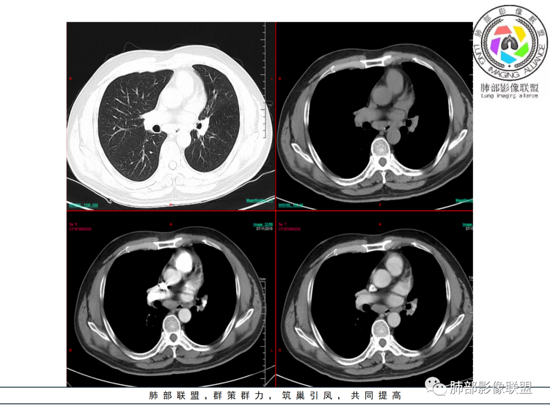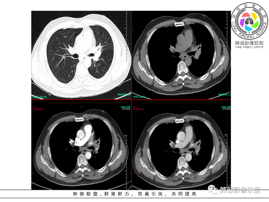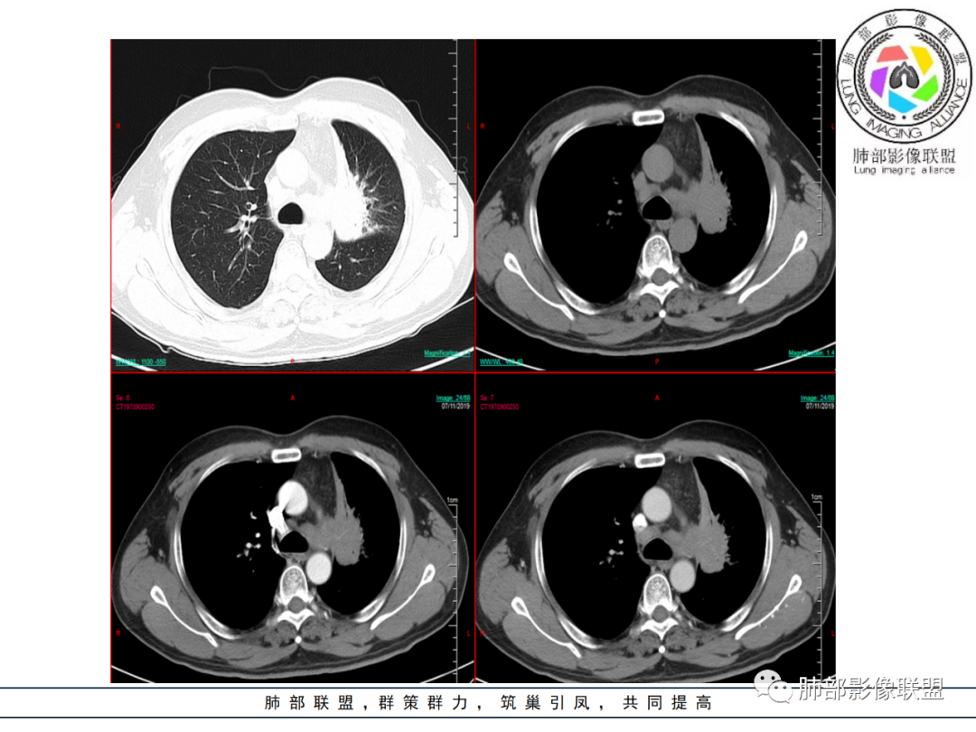 患者中年男性,咳嗽、咳痰1月余,同时伴有胸闷不适。胸CT:左肺上叶占位并膨胀不全,左肺上叶支气管支气管不规则狭窄,左肺固有上叶开口呈鼠尾状闭塞。纵隔窗:4L 4R 6 7 左肺门淋巴结肿大,增强静脉期较动脉期强化,血管包埋,左肺下叶肺动脉纤细。 医学百科网 | YxBaike.Com