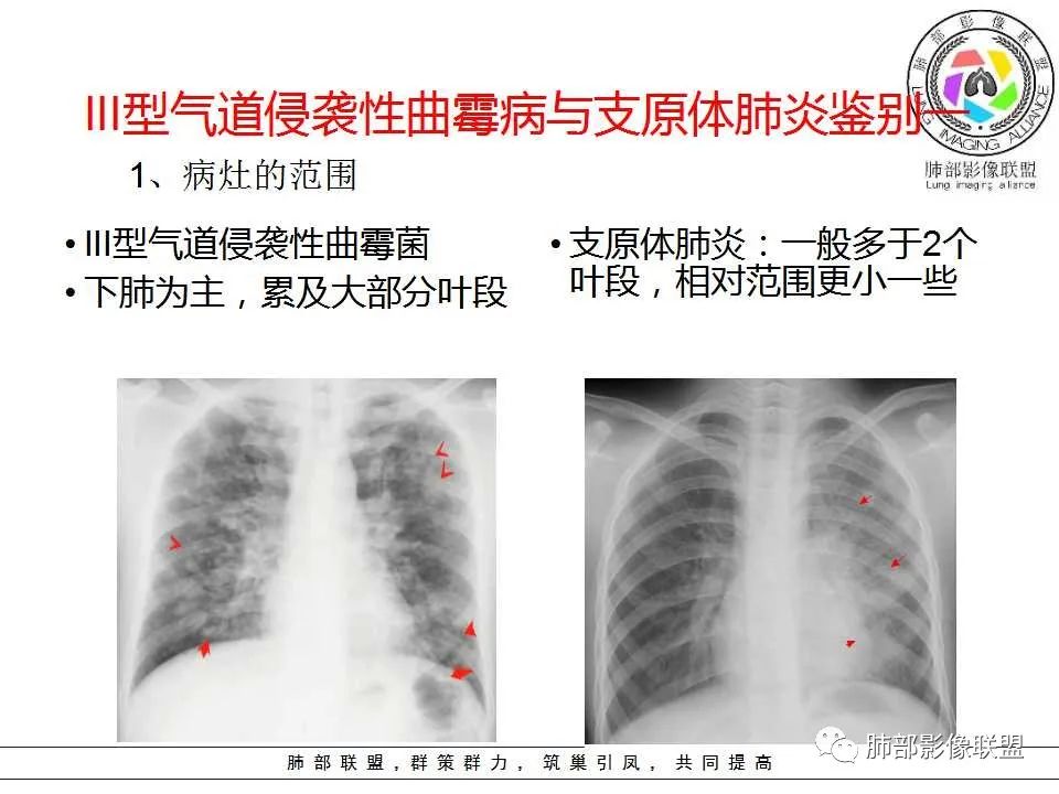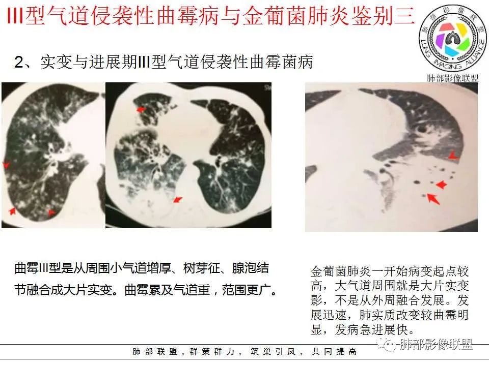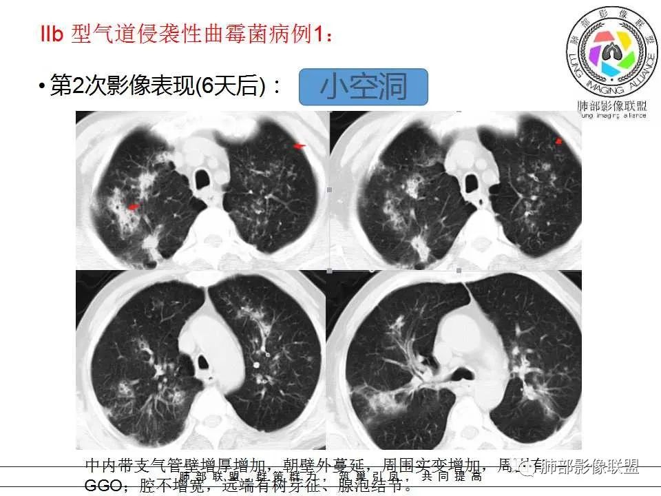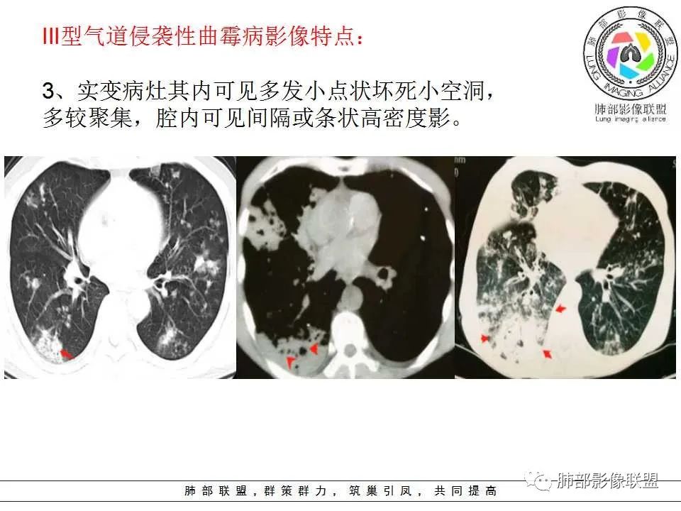 3、影像上病灶主要发生部位:①支气管腔为主(ABPA);②支气管壁、细支气管(气道侵袭性曲霉菌病);③肺血管(血管侵袭性曲霉菌病);④囊腔内(慢性、寄生型肺曲霉菌病)。