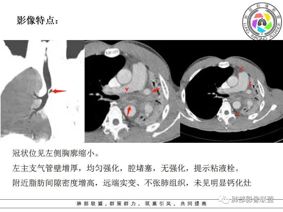 4、气道侵袭性曲霉菌的常见影像表现:①气管、主支气管、叶段支气管壁弥漫增厚;②支气管腔内粘液栓。 医学百科网 | YxBaike.Com