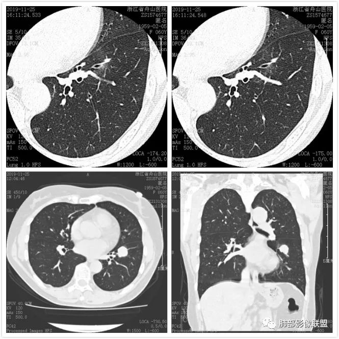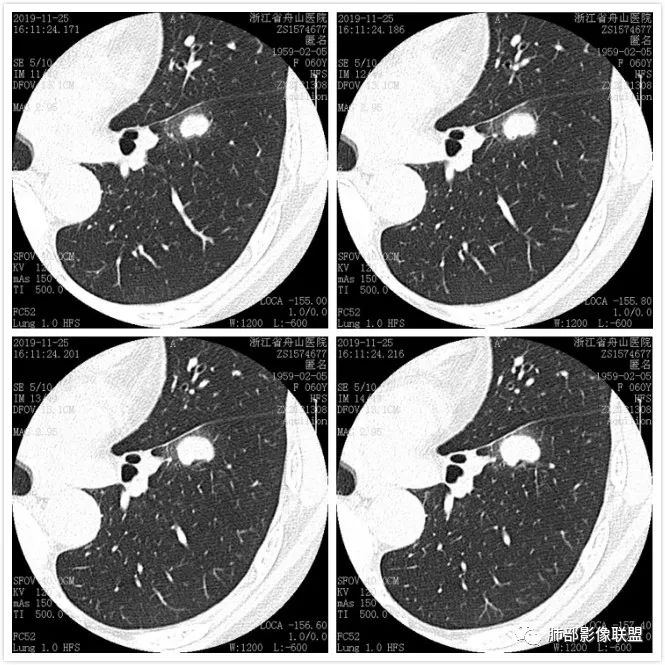 这个病例看上去像个爱心,但是具备恶性征象不少,有分叶,脐凹,支气管截断,膨隆,月牙铲等。没有毛刺,牵拉力不强,多见于低分化肿瘤,其收缩力可以消失,特别是实体型。实体型内部纤维组织很少。与不典型类癌鉴别比较难,典型类癌分叶不明显;不典型类癌男女比例差不多,少见。