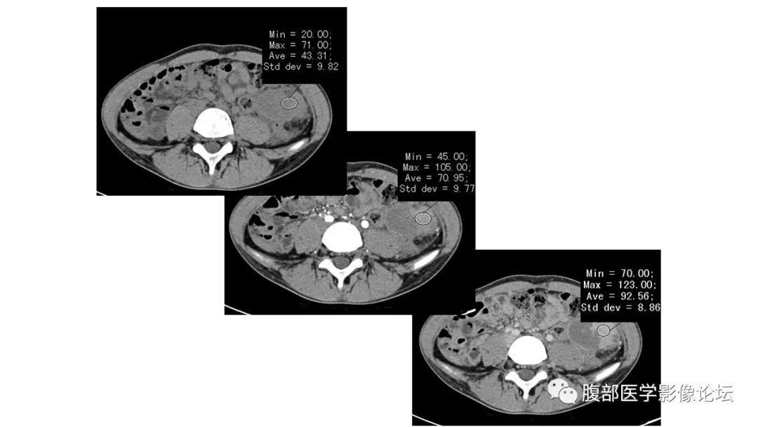 1.张文坦:左侧髂窝肿块,卵圆形,静脉汇入脾静脉,增强部分有强化,无强化区弥散高信号,部分可见暗化,周围渗出比较厉害,比较年轻,急性病程,炎性指标明显高,考虑副脾扭转部分梗死出血。鉴别IMT一般形态比较不规则,囊变坏死区范围小。 医学百科网 | YxBaike.Com