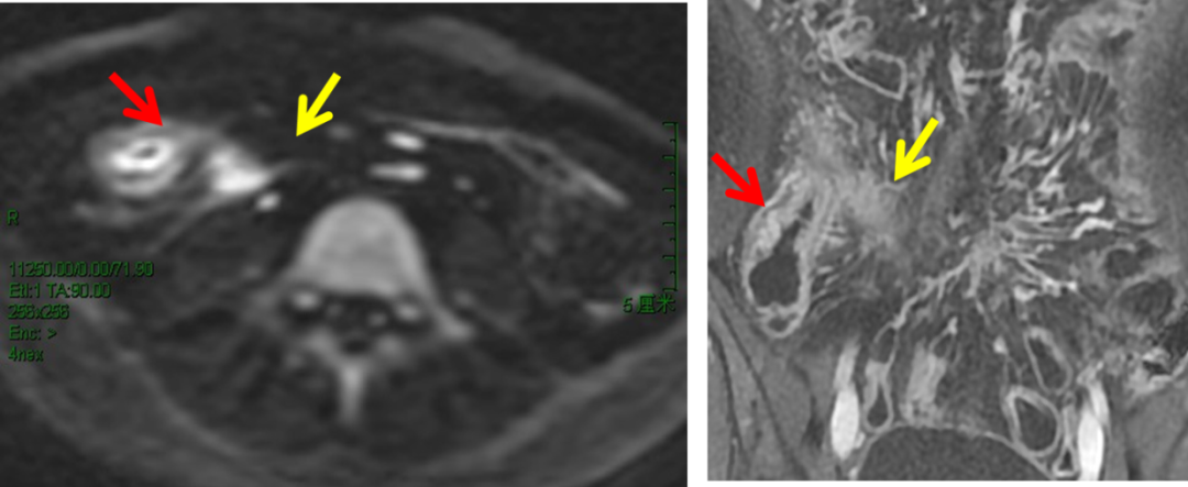 DWI 扫描显示病变肠段粘膜面信号明显增高(红箭头),提示病变处于活动期受累肠段旁脓肿信号明显增高(黄箭头),使病变显示更清晰