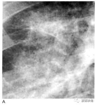 斑片状肺实变有时在胸部X线片或CT上显示为小叶或多小叶的病变(包括孤立的肺小叶)(图4),可表现为一些小叶密度增高而临近小叶充气正常。
