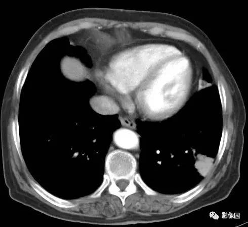 病史:女,77,体检发现左下肺占位5天。CT平扫肿物CT值约为40Hu,增强后约95HU