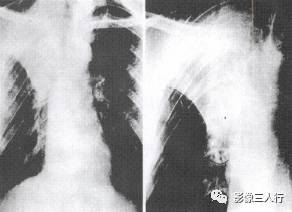 右肺下叶不张:位于心脏右缘旁,呈现大容积的高密度影,右肺门下移,右膈升高,心 影向右侧移位,高密度影的前缘为后移的斜裂线。