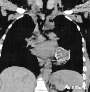 图6 畸胎瘤:胸部冠状面CT平扫可见中纵隔左心缘旁类圆形低密度影,边界清晰,其内密度不均匀,内部见骨样密度影,周边见壳状钙化