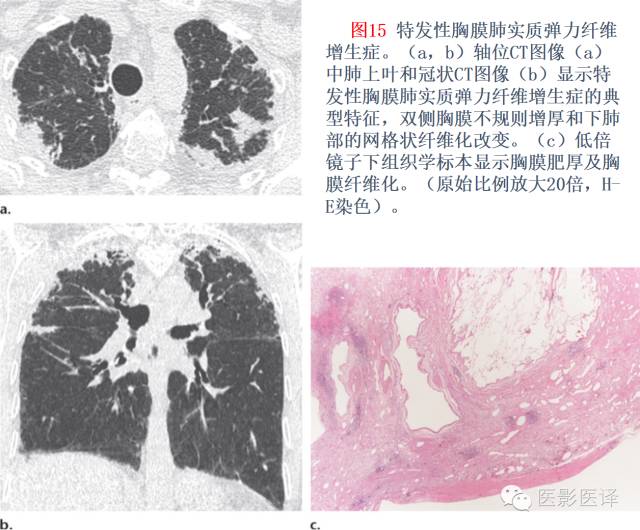 特发性胸膜间质弹力纤维化是罕见病,富含弹力纤维,病变涉及胸膜及胸膜下肺实质,主要分布在上叶肺组织。60%的病例疾病会有所进展,40%的病人死于此病。