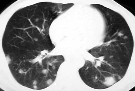 分析:蕈样肉芽肿是T细胞淋巴瘤的一种,早期主要发生在皮肤,表现为湿疹或牛皮癣样改变。随着病情进展,各个器官均有不同程度累及,最常见为淋巴结、肝和肺,约50%的患者有肺部受累。影像学表现多种多样,双肺多发的实性结节,片状致密影,或弥漫性网状结节样改变,可伴有胸腔积液,部分病程发展较快,与大叶性肺炎相似。