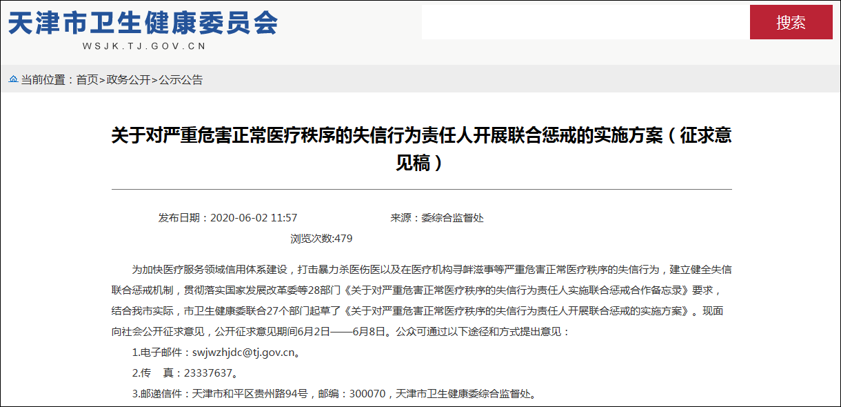 6月2日,天津市卫健委联合27个部门,结合国家发展改革委等28部门《关于对严重危害正常医疗秩序的失信行为责任人实施联合惩戒合作备忘录》要求,起草了《关于对严重危害正常医疗秩序的失信行为责任人开展联合惩戒的实施方案》,现正面向社会公开征求意见。
