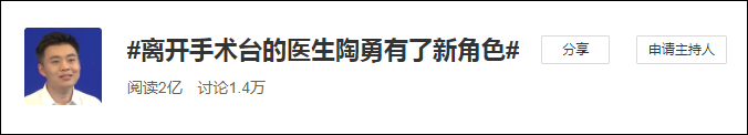 另一则是陶勇医生又上了热搜,这次热搜话题为#离开手术台的医生陶勇有了新角色#。 医学百科网 | YxBaike.Com