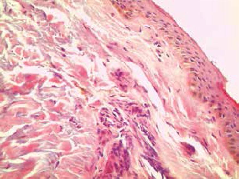 实验室检查血常规、生化指标及尿检结果均在正常范围内。类风湿因子、抗CCP和抗核抗体均为阴性,红细胞沉降率(ESR)为21 mm/h,C反应蛋白(CRP)水平为0.9 mg/dl。血浆皮质醇水平、促肾上腺皮质激素(ACTH)值和甲状腺功能均在正常范围内。肿瘤标志物筛查阴性,腹部超声、上消化道内镜、结肠镜、乳腺摄影均未发现异常。皮肤活检显示基底层黑色素沉积(图4)。