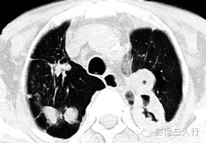 1)浸润性肺结核:CT表现为斑点或斑片状实变,呈小叶性分布,其内可见不规则的多发空洞。
