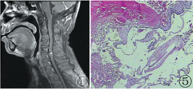 MRI表现:C5~C6段脊髓内见一大小约0.6 cm×0.6 cm×1.5 cm混杂信号影,T1WI呈混杂等/稍长信号,其内可见小结节状高信号影(图1),T2WI呈混杂稍长信号影,病灶边缘可见低信号环(图2),病变节段脊髓稍增粗,周围蛛网膜下腔变窄;病变增强呈中度不均匀强化表现(图3,4)。术中所见:显微镜下沿脊髓后正中切开脊髓组织后,见脊髓组织肿胀,水肿较重,占位周围见暗红色陈旧性出血,占位呈红褐色,与周围组织分界欠清,完整切除占位约1.0 cm×1.0 cm×1.0 cm,质地较硬。病理:灰白灰褐色不整形组织1块,体积1.0 cm×0.5 cm×0.5 cm,(C5~6髓内占位)病变符合脉管瘤伴混合血栓形成(图5)。