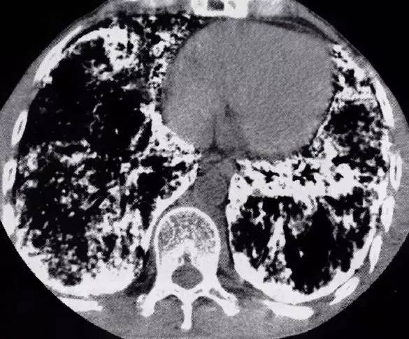 双肺实质满布弥漫性砂粒状高密度影,双肺后部融合呈高密度片