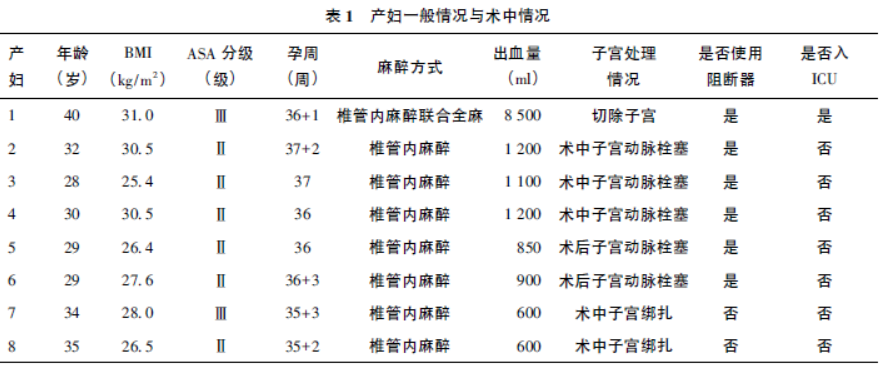 方法:住院产妇择期剖宫产前先在介入科放置主动脉球囊阻断器,后立即入手术室准备剖宫产。急诊出血入院直接入手术室,在手术室放置主动脉阻断器。产妇入室后,监测BP、ECG、SpO2,有创动脉穿刺测压、深静脉置管,建立18号外周静脉通路,术前备红细胞3U、血浆600ml、冷沉淀10U,白蛋白100ml,凝血酶原复合物等凝血物质,8例产妇均先予腰硬联合椎管内麻醉,重比重0.5%布比卡因2ml蛛网膜下腔给药,平面控制在T6以下,硬膜外置管必要时给予2%利多卡因,7例在腰硬联合麻醉下完成手术,1例取出胎儿后因出血多加用气管插管全身麻醉,术中根据出血情况补充红细胞和凝血物质。6例取出胎儿后立即使用了主动脉阻断器,2例术中没有使用阻断器,没有子宫动脉结扎,术后出血也不多。8例均行子宫绑扎,6例行子宫动脉结扎术,4例产妇在术中行子宫动脉栓塞术;2例术后行子宫动脉栓塞术,1例切除子宫。术毕1例产妇入ICU,余7例送回病房。观察指标:记录产妇麻醉方式,出血量,子宫处理情况,是否使用阻断器,术中输血情况,术后是否入ICU。记录新生儿体重和1、5minApgar评分。