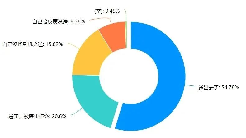 做过手术的816名患者中,有82%的患者(668人)考虑过送红包。其中有502人(75%)患者付诸实施,其中364人成功将红包送出,138人被医生拒绝,我们不得不承认,即使在一二线医院,手术红包依然是一个普遍存在的现象。