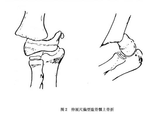 肱骨髁上骨折最多见,占90%以上。跌倒时肘关节处于半屈曲位或伸直位,手掌着地,暴力沿前臂传导至肱骨下端,将肱骨髁推向后方,而重力将肱骨干推向前方,造成肱骨髁上骨折。骨折线由前下斜向后上方,骨折远端向后上移位,近端向前下移位,严重时可损伤正中神经和肱动脉。按骨折的侧方移位情况,又可分为尺偏型和桡偏型。其中尺偏性骨折肘内翻发生率可高达74%。