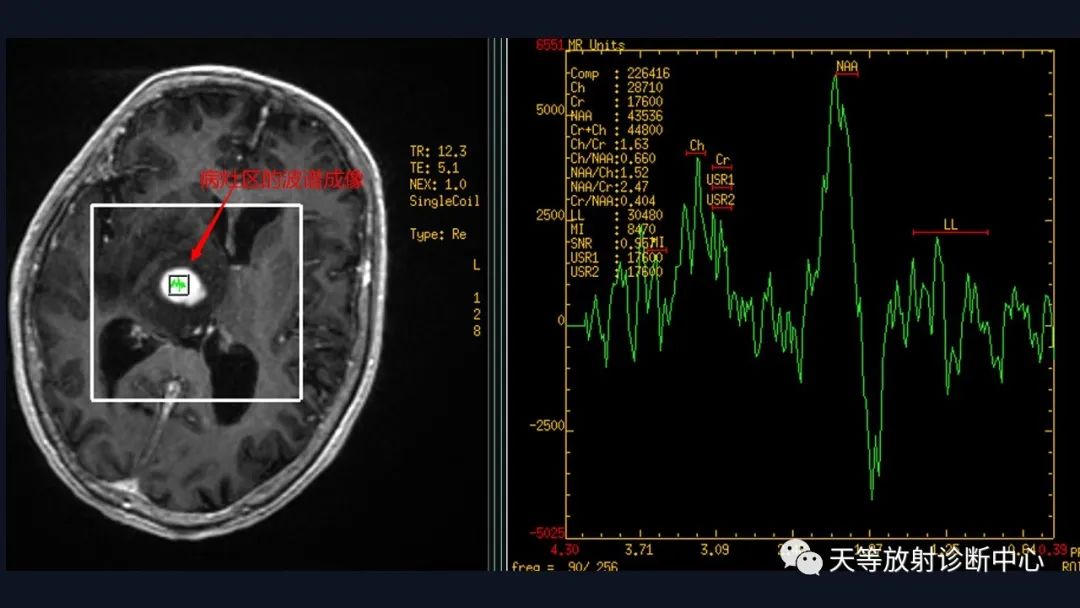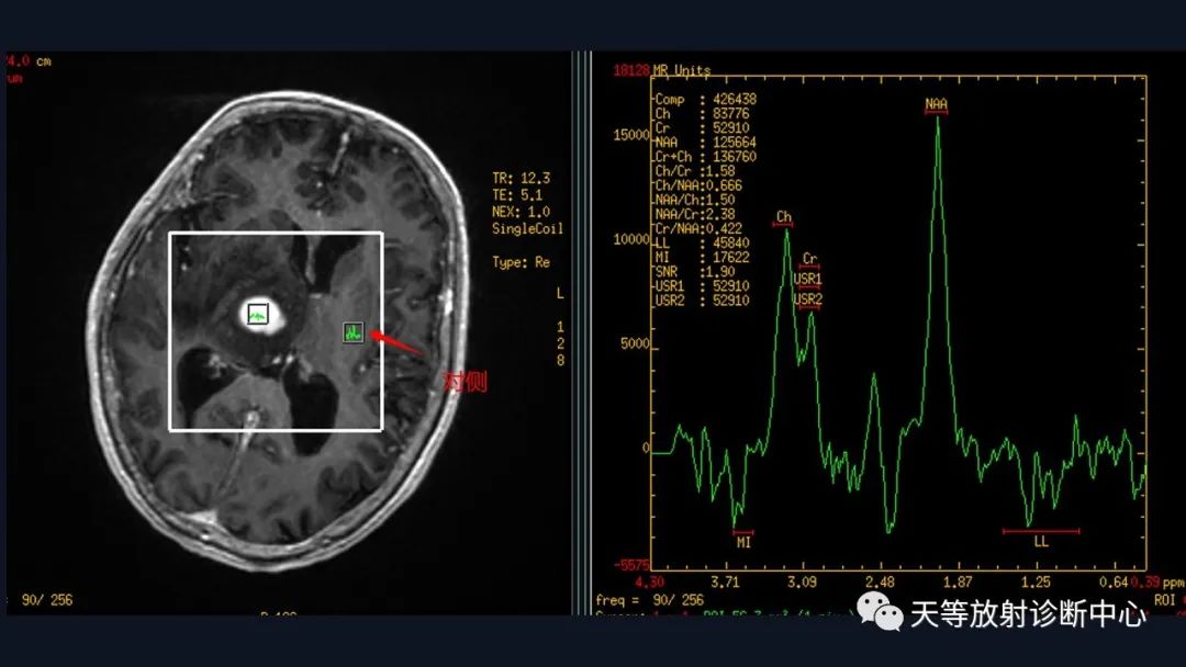 第二个高峰就是Cho,胆碱峰Cho的波谱位于3.2 ppm处,峰值下降,细胞膜合成和降解受破坏