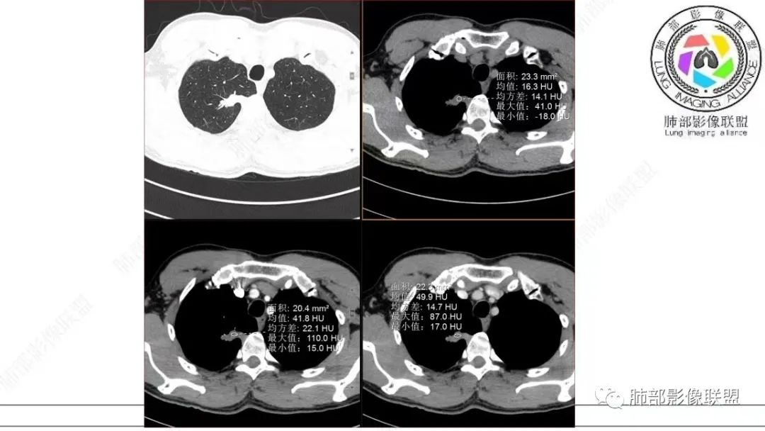 还是和病变成分有关。在肿瘤当中,或者上皮间质转换比较明显等,可以有不同的强化方式。当然也可以表现为延迟强化,可以动脉期明显强化。和肿瘤的具体类型,以及具体病变的病理成分有关。多层面观察,病变是明确有细支气管进入的,而且明确的有铸型的低密度粘液栓。