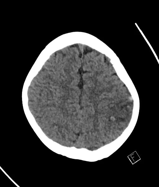 有一个明显的高密度皮质静脉(致密静脉征),代表上吻合静脉,临近皮层增厚伴低密度,没有致密动脉征象。