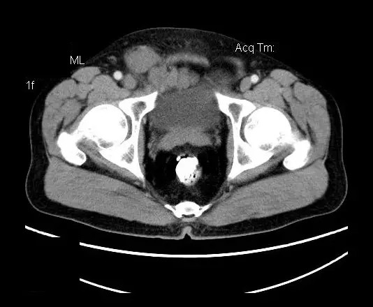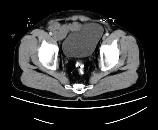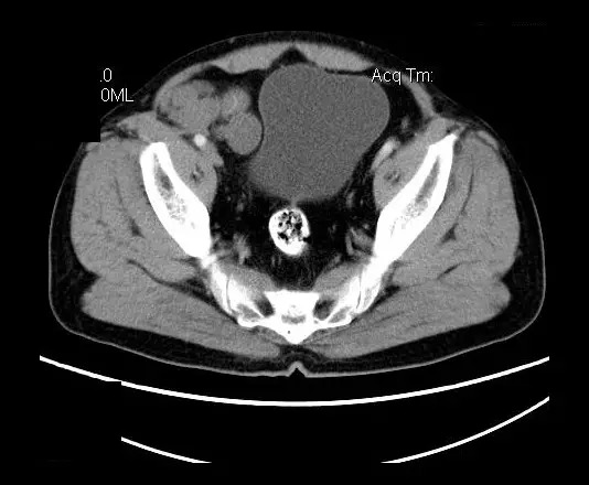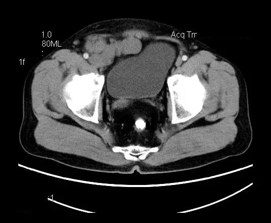 男,50岁,发现盆腔包块一月,无明显触痛,不伴发热。