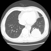 性别:男,年龄:60岁,患者1年半前因咳嗽于当地医院查胸部CT示左肺下叶占位,行抗感染及对症治疗后症状缓解,未复查。半月余前出现发热,体温最高37.5℃,伴咳嗽,咳少量白色偶有黄色粘痰,左侧胸痛。