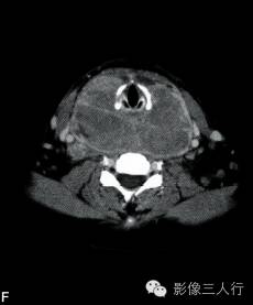 双侧甲状腺、颌下腺及咽淋巴环见多发结节融合状软组织影,边界不清,可见包膜,病灶密度欠均匀,内可见线样分隔,未见明显坏死及钙化,双颈各区可见大小不等的淋巴结,边界欠清,密度较均匀(图A~C)。增强横断面(图D~F)扫描双侧甲状腺、颌下腺及咽淋巴环病灶包膜及分隔可见明显强化,双颈淋巴结可见较明显强化。