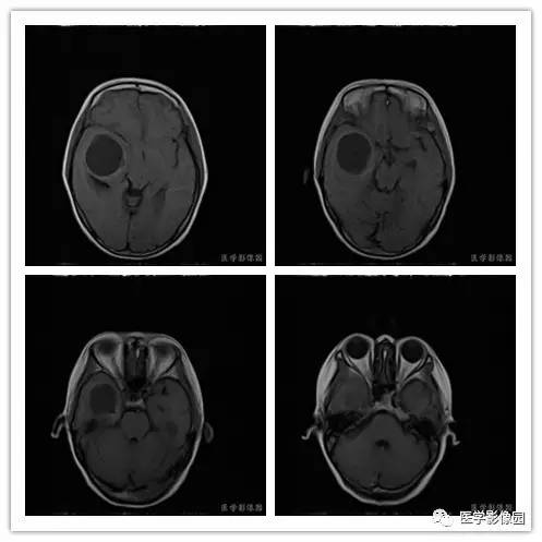 影像学表现:右侧颞叶深部区见一长T1、长T2囊样信号,成明显环形强化、未见明确结节影,没有FLAIR和DWI图,内见分隔,边界较清,周围水肿不明显,右侧脑室明显受压、颞角扩大,右侧脑沟明显变浅,脑中线结果向左偏移。