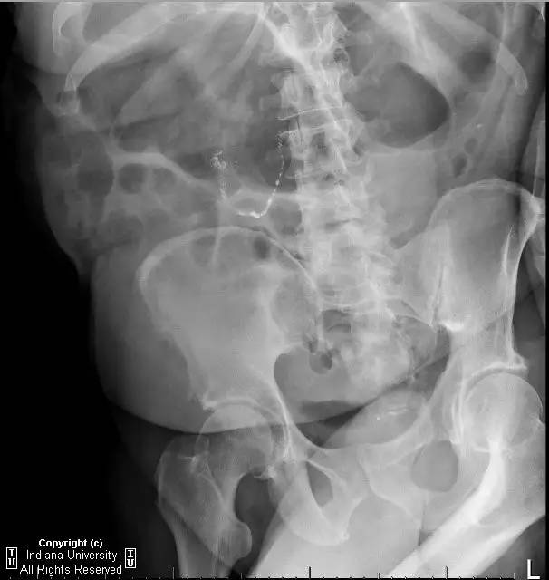 【影像学表现】右侧腹部可见曲线样不透亮区,1周后位置有变化(似进入盲肠)。横结肠显著扩张、充气。CT上扩张原因不明,无明确的梗阻证据。