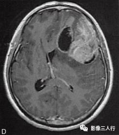①转移瘤:脑内转移瘤亦以中老年人多见,幕上多见,易发生出血、囊变和坏死。单发的转移瘤和胶质母细胞瘤表现相似。但转移瘤多位于皮髓交界区,且常有原发肿瘤的病史可资鉴别。②淋巴瘤:较少见,约占颅内肿瘤的1%左右。肿瘤多位于脑白质深部,T1WI多呈低或等信号,T2WI呈等或稍低信号;增强扫描多为“握拳样”或“团块样”强化,环形强化较少。③脑脓肿:在脓肿壁形成后,其边界清楚,平扫其壁表现为1层或2层T1WI等或稍高信号、T2WI低信号的较完整的环;增强后表现为薄壁、较规则的环形强化,与胶质母细胞瘤明显不同。