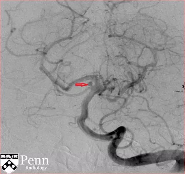DSA:是诊断血管病变的金标准,具有非常高的空间分辨率和时间分辨率。可在动脉分叉处看到囊状影。破裂部位常可看到「墨菲乳头」。