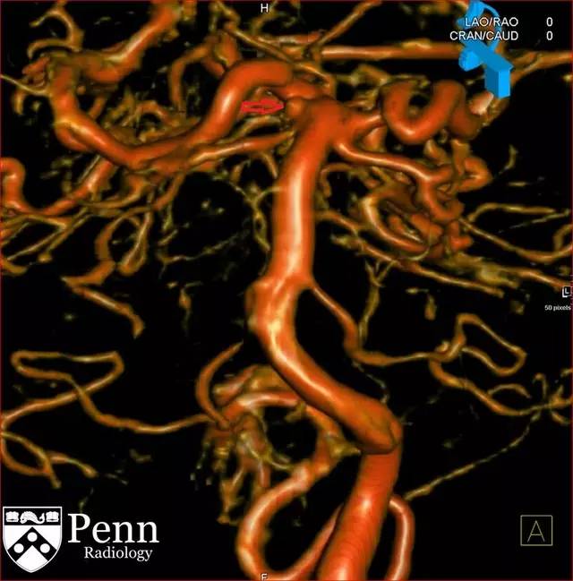 CTA 示右侧右小脑上动脉一大小为 2.0 x 2.0 x 1.2 mm 的动脉瘤。