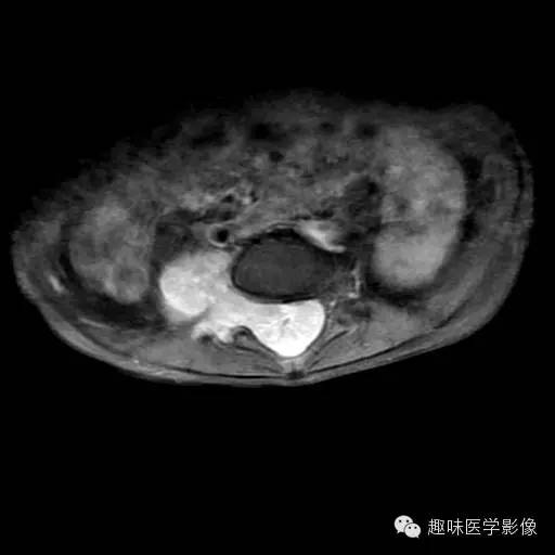 腰4-骶3椎管内硬膜外见等T1稍长T2弥漫性生长肿块,蛛网膜下腔受压变窄,前移,硬脊膜前移,自邻近椎间孔向外生长至右侧腰大肌内后方,局部椎间孔扩大,腰大肌受压前移。