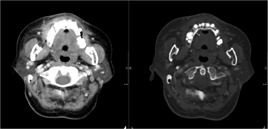 男,55岁,左下后牙反复肿疼1年余,加重1月余,疼痛剧烈伴张口受限,面部肿胀。