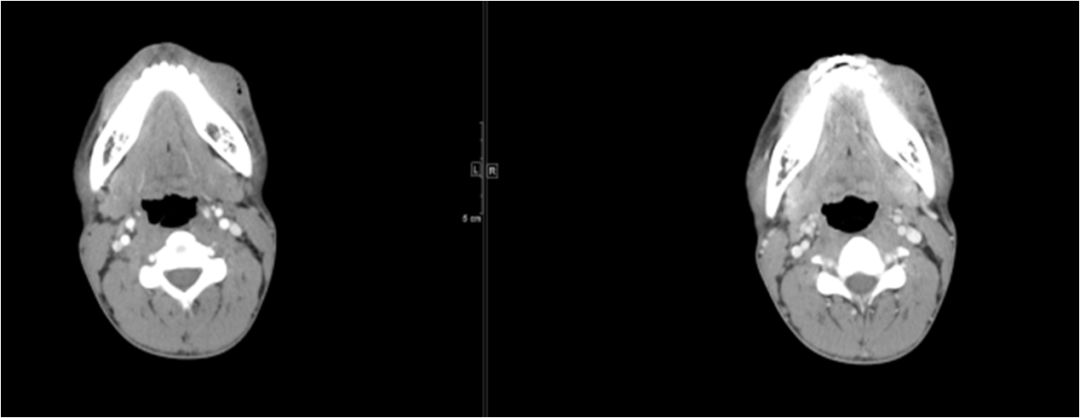 男,61岁,左侧面颊部、颌下、颏下肿胀15天,表面皮肤稍红,皮温不高,未扪及明显波动感。