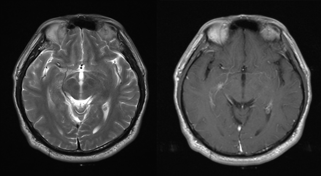 仔细观察本例左侧颞叶强化结节,中心为明显强化,周围为稍淡淡样的强化,此为毛细血管扩张症的特点。