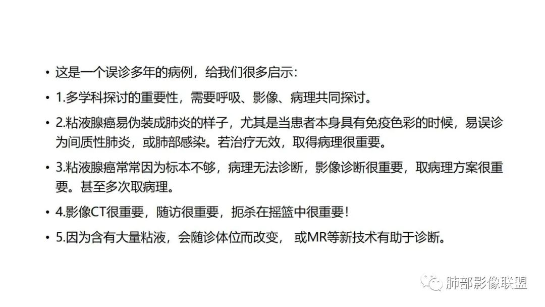 3.粘液腺癌常常因为标本不够,病理无法诊断,影像诊断很重要,取病理方案很重要。甚至多次取病理。